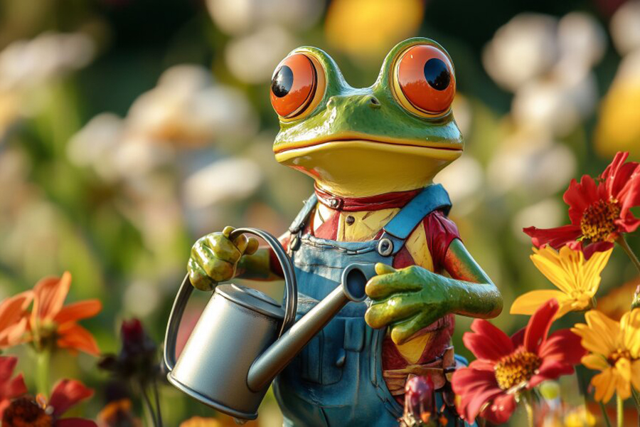 Foto: „Skurriler Frosch in Gärtner-Outfit gießt Blumen im Garten“ von Marco Verch via ccnull.de, CC-BY 2.0